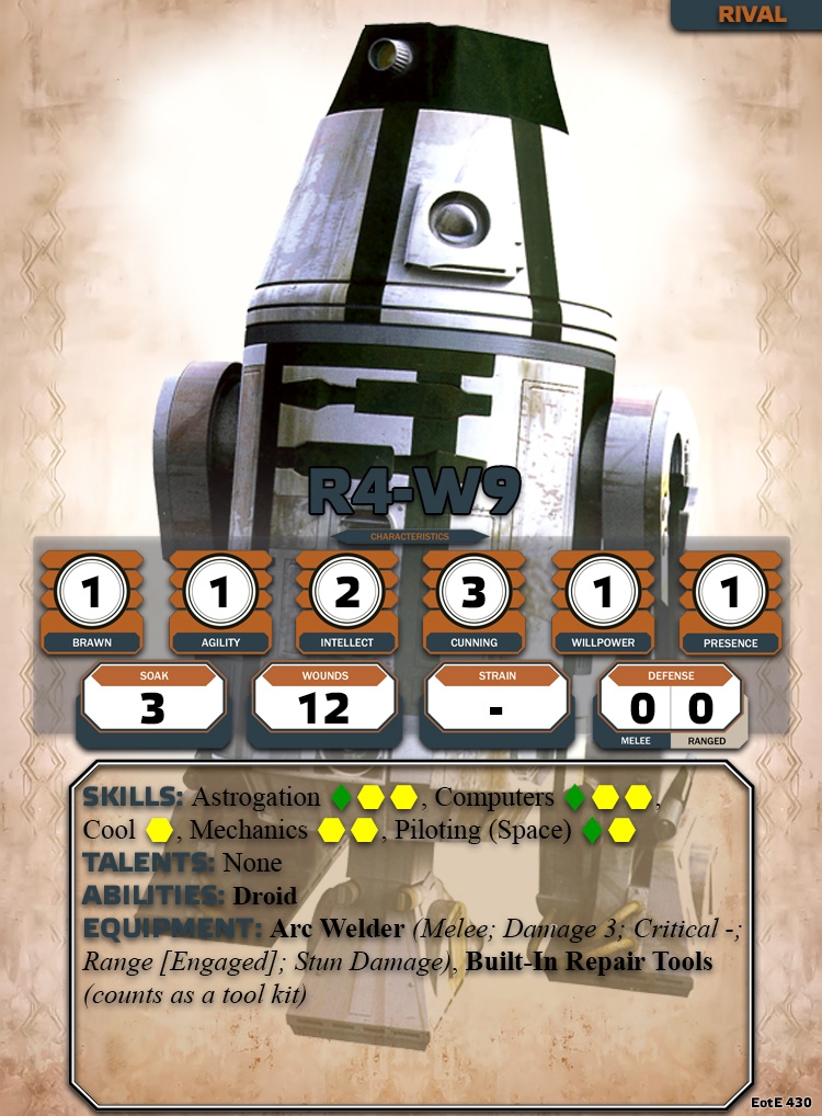 Did the PCs successfully rescue R4-W9 the astromech droid with the advanced astrogation data in and around the region? Gaining this reward will benefit the PCs in the Season 1 finally of the Kessel Run Special Event. Do the PCs intend on delivering the droid back to Ranem “The Glove” Tiiv?