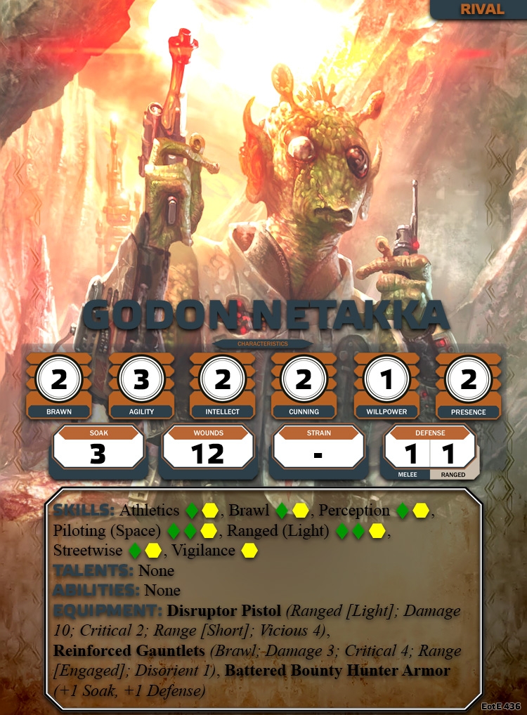 Did the PCs successfully recruit Godon Netakka? If so he can be taken as a contact. Or did the PCs end up in combat with Godon Netakka turning him into a rival. It is important to note this relationship as he returns in the Kessel Run 3 part adventure.