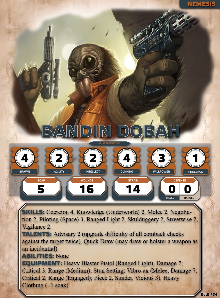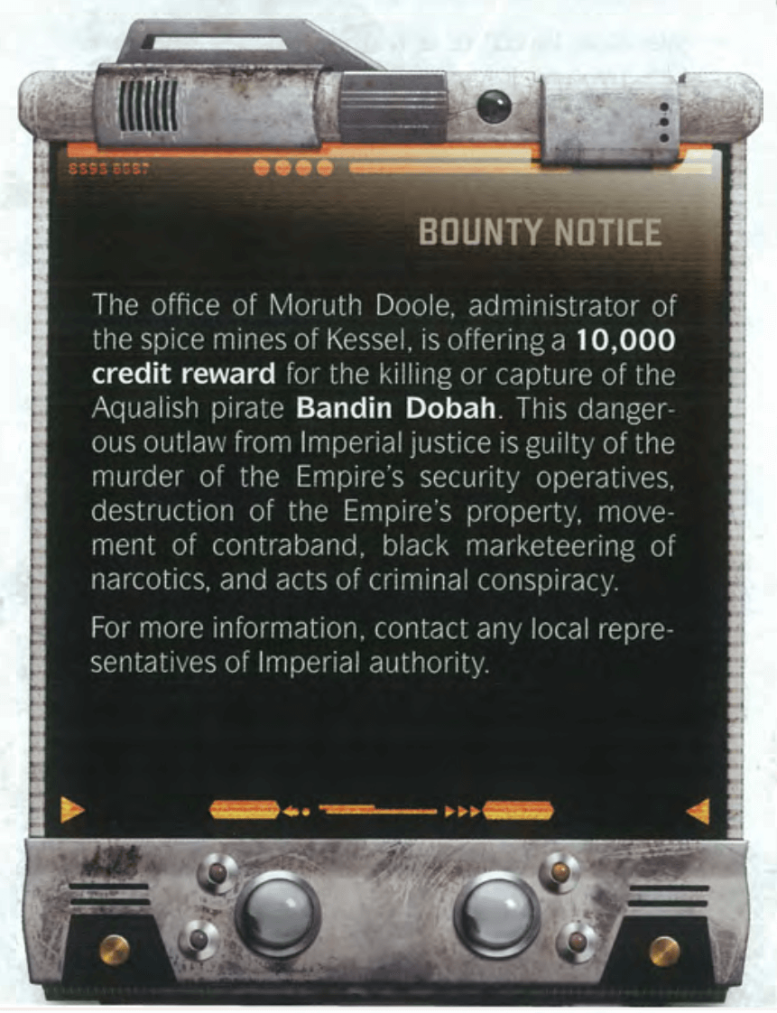Turning in the Bounty: If the Players are unsure which party holding a bounty against Bandin Dobah, The Empire or the Hutts, the GM is encouraged to nudge the players in the direction to bring Bandin Dobah to Kessel and turn him in there. This will add to the Kessel Run Adventure Series that occurs later in the season.