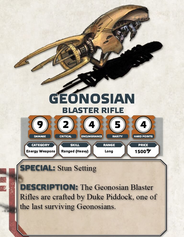 Furthermore, it should be noted that Mu Nanb is watching the PCs actions during the party. Mu Nanb was sent by Orta for the Rebellion to back up the PCs and observe if they are good candidates for joining the Rebel Alliance. If the PCs seem to be assets who would match the Rebel Cause then he can offer the PCs an adventure hook to travel to Mesa 291 to meet an agent known as Fulcrum (aka Tiere) where the PCs have an opportunity to join the Rebel Alliance. This is a hook for Rebel Breakout an Age of Rebellion adventure. If the PCs impress Mu Nanb or if the PCs negotiate an amazing deal of gun running between the Rebellion and the Geonosians award the PCs 5 Duty. Now as a GM you may ask why seed the Age of Rebellion Story in an Edge of the Empire Adventure. This is because THE BARRON who is the PCs Contact and original benefactor works both in the underworld as part of his intelligence network as well as in support of a Rebel Cell. If the PCs manage to work out a great deal for the Rebellion it will also add Geonosian Blaster Pistols, Rifles, and Carbines to the Rebellion for use in the Onslaught at Arda adventure.