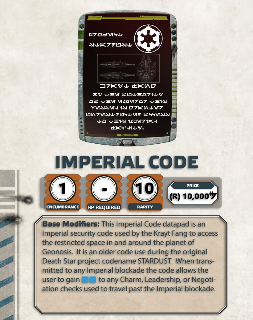 Arrival on Geonosis: The GM is encouraged to add a bonus encounter describing the arrival of the PCs to Geonosis. Geonosis was a former construction location for the Death Star. Upon completion the Empire committed genocide to the Geonosian people leaving all dead except for an insane queen and her battle droids. After which the Empire abandoned the planet leaving a few large construction stations in orbit above the system. Duke Piddock and Duke Dimmock returned to their homeworld after this genocide and after the Empire abandoned the world. Because they have returned the Imperials have stationed a small fleet of ships in orbit to search for the survivors. The codes provided by Ota should allow the PCs to enter the system. These codes identify the PCs as Imperial Private Assets to assist in the hunt for the Geonosians. However, bad rolls on their Astrogation check which include 3 threat or despair can result in the PCs coming out of hyperspace too close to the Imperial Star Destroyers resulting in a search of their starship. This can result in a social encounter while the PCs nervously gain access to the planet. The Krayt Fang is known to the Imperials giving the PCs boost on all social encounter checks as the Imperials have had close dealings to Teemo the Hutt and use Trex’s services to hunt the Geonosians. The Imperials can question where Trex is, resulting in the PCs having to lie to the Imperials. Little do the Imperials know that Trex did find the Geonosians and Teemo began to use this to his advantage in the development of battle droids below the Mesa of Mos Shuuta.