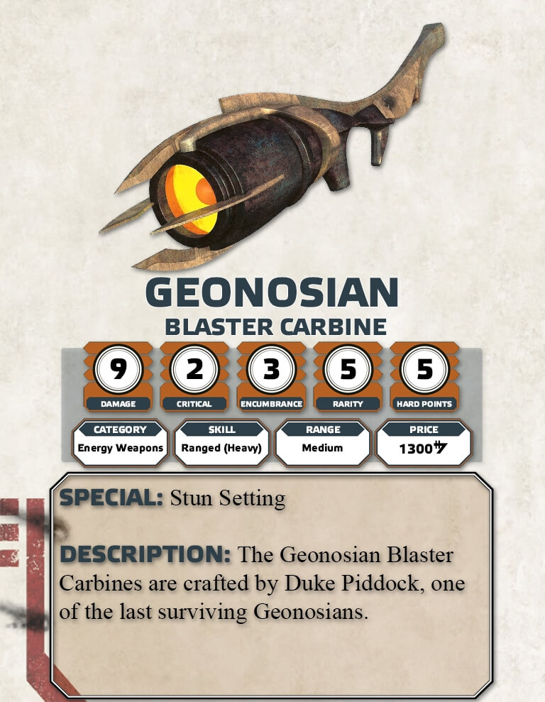 Furthermore, it should be noted that Mu Nanb is watching the PCs actions during the party. Mu Nanb was sent by Orta for the Rebellion to back up the PCs and observe if they are good candidates for joining the Rebel Alliance. If the PCs seem to be assets who would match the Rebel Cause then he can offer the PCs an adventure hook to travel to Mesa 291 to meet an agent known as Fulcrum (aka Tiere) where the PCs have an opportunity to join the Rebel Alliance. This is a hook for Rebel Breakout an Age of Rebellion adventure. If the PCs impress Mu Nanb or if the PCs negotiate an amazing deal of gun running between the Rebellion and the Geonosians award the PCs 5 Duty. Now as a GM you may ask why seed the Age of Rebellion Story in an Edge of the Empire Adventure. This is because THE BARRON who is the PCs Contact and original benefactor works both in the underworld as part of his intelligence network as well as in support of a Rebel Cell. If the PCs manage to work out a great deal for the Rebellion it will also add Geonosian Blaster Pistols, Rifles, and Carbines to the Rebellion for use in the Onslaught at Arda adventure.