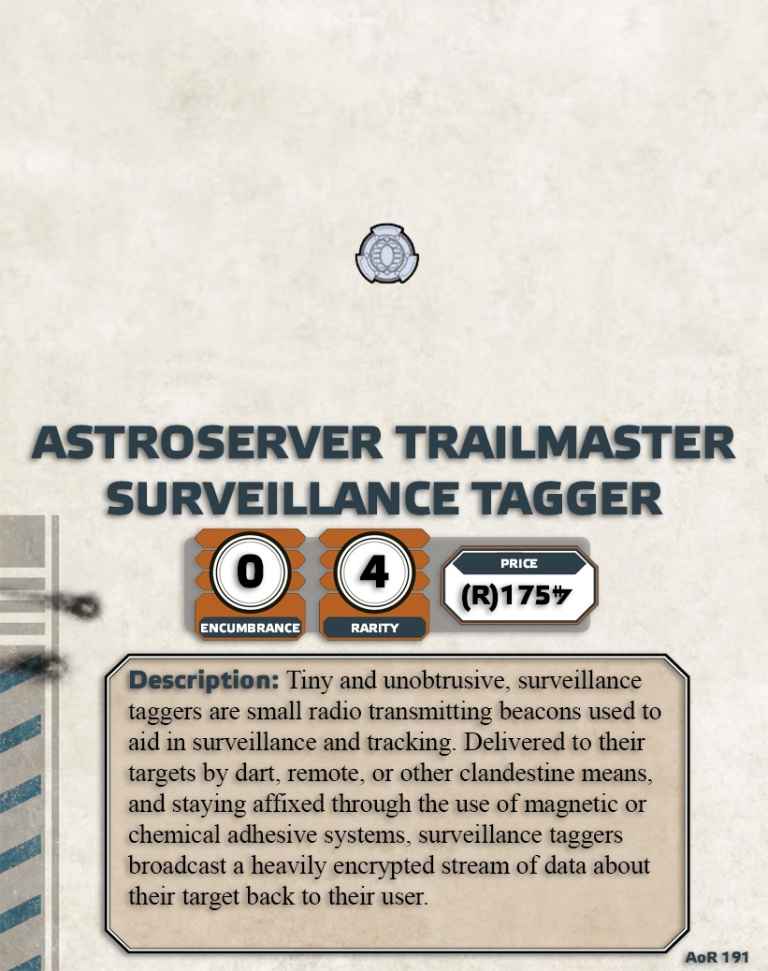 Running the Investigation: It is recommended that you also take a look at the “Running an Investigation” rules found in the Bounty Hunter Supplement Book, No Disintigrations pg. 75, but also in the Sentinal Supplement Book, Endless Vigil pg. 80.