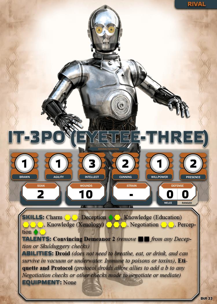 Tale of the Sa Nalor: The Game Master should ask to see any Player Adventure Logs the players have in regards to Beyond the Rim: Act 1: Tale of the Sa Nalor. The Game Master should pay particular attention to the fate of IT-3PO and who is in possession of the droid.