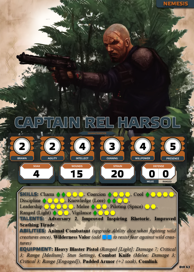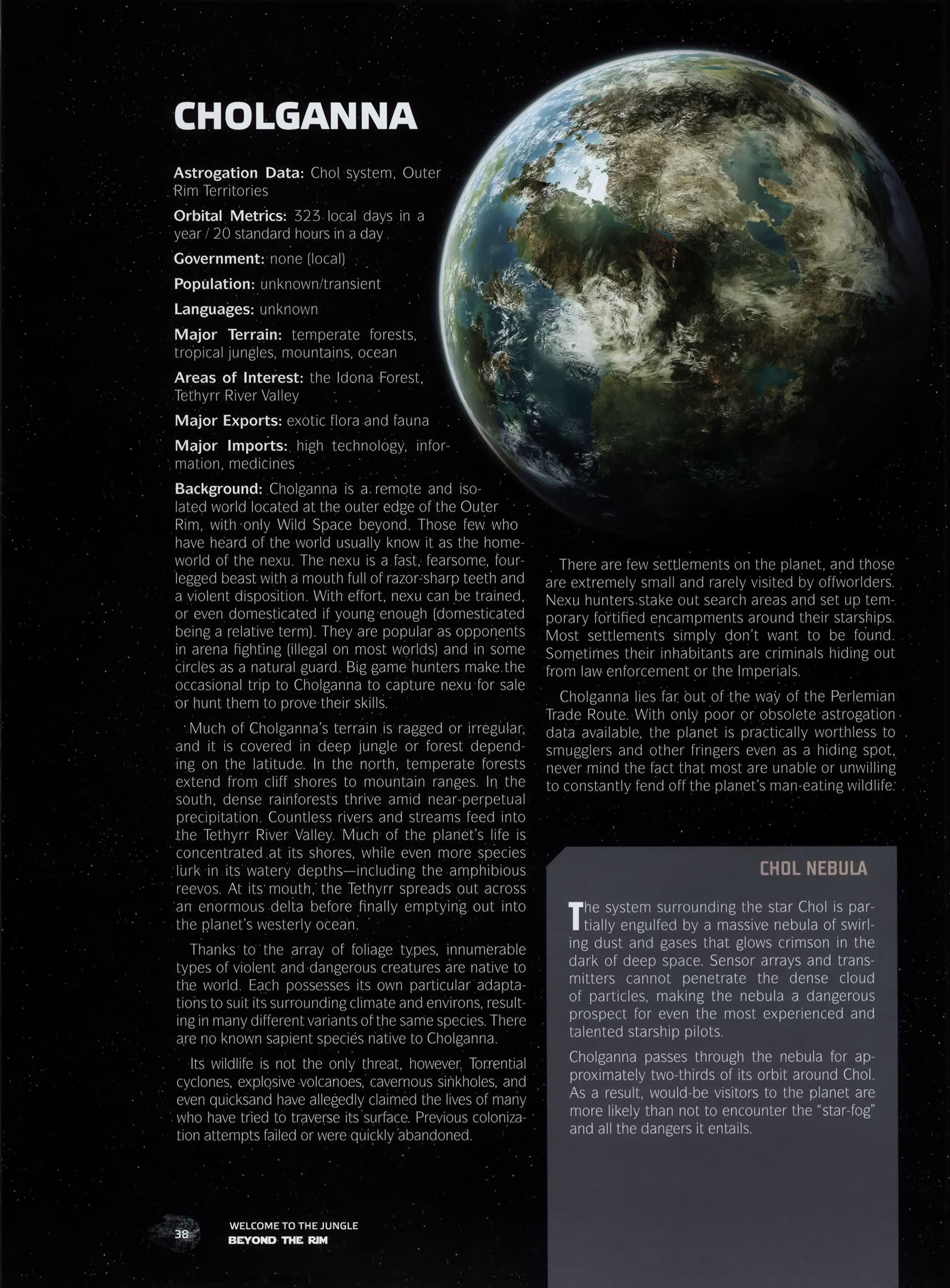 Beyond the Rim – Act 2: Welcome to the Jungle opens with the PCs enroute from The Wheel to the planet of Cholganna to search for the Sa Nalaor. Players should have completed Act 1 of Beyond the Rim prior to playing Act 2: Welcome to the Jungle. If a player is new to the story they may be introduced with a bonus encounter that involves Trandoshan Big Game Hunters bringing prisoners to Cholganna to hunt in the Jungle. If this is the case proceed to the bonus encounter below.
