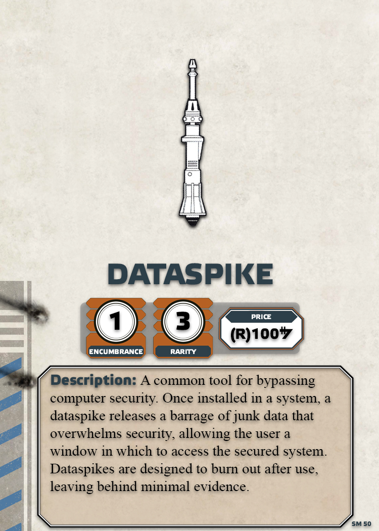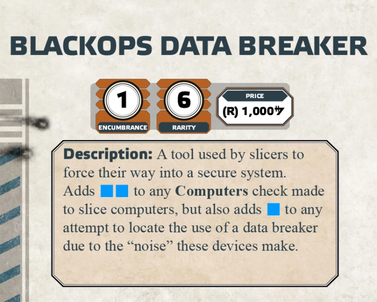 Slicing Encounters: In Act 2: the party will be conducting a slicing encounter. It is encouraged that the GM review the Slicing rules in both the Technician Supplement Book, Special Modifications on page 86 and the Spy Supplement Book, Cyphers and Masks pg. 82