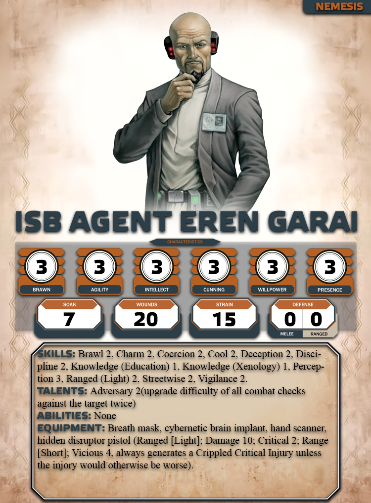 In the final encounter when the PCs face off against ISB Agent Garai consider including an Imperial Inquisitor based on how the PCs performed in Act 1: A Wealth of Knowledge. If it was discovered the PCs are Force Sensitive or possible Jedi an Inquisitor is assigned to hunt down the party. We recommend the use of the Fourth Sister and her secret Padawan Jerserra. This will be a great way to foreshadow the Ghosts of Dathomir adventure when the players later encounter Jerserra.