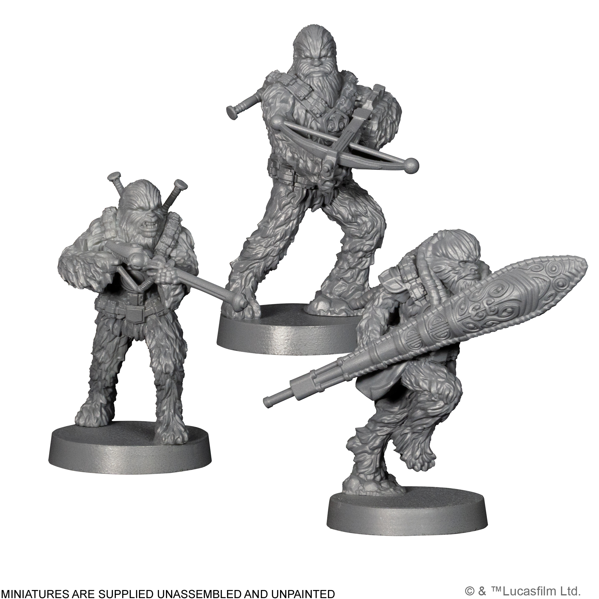 The Wookiee Warriors Unit Expansion puts six Wookiee Warrior miniatures that can be assembled and used in a variety of ways at your command, including as either a close-range unit carrying ryyk blades and Kashyyk pistols or a unit of Wookiee sharpshooters firing X1 Carbines. No matter how you assemble your miniatures, four upgrade cards invite you to field these units for both the Republic and Rebel factions. Additionally, a miniature representing a Wookiee Chieftain can enter the fight as a Republic commander and a fifth unit card and three command cards let them further influence your strategy. Finally, eight upgrade cards invite you to customize your units with Wookiees carrying an array of weaponry.